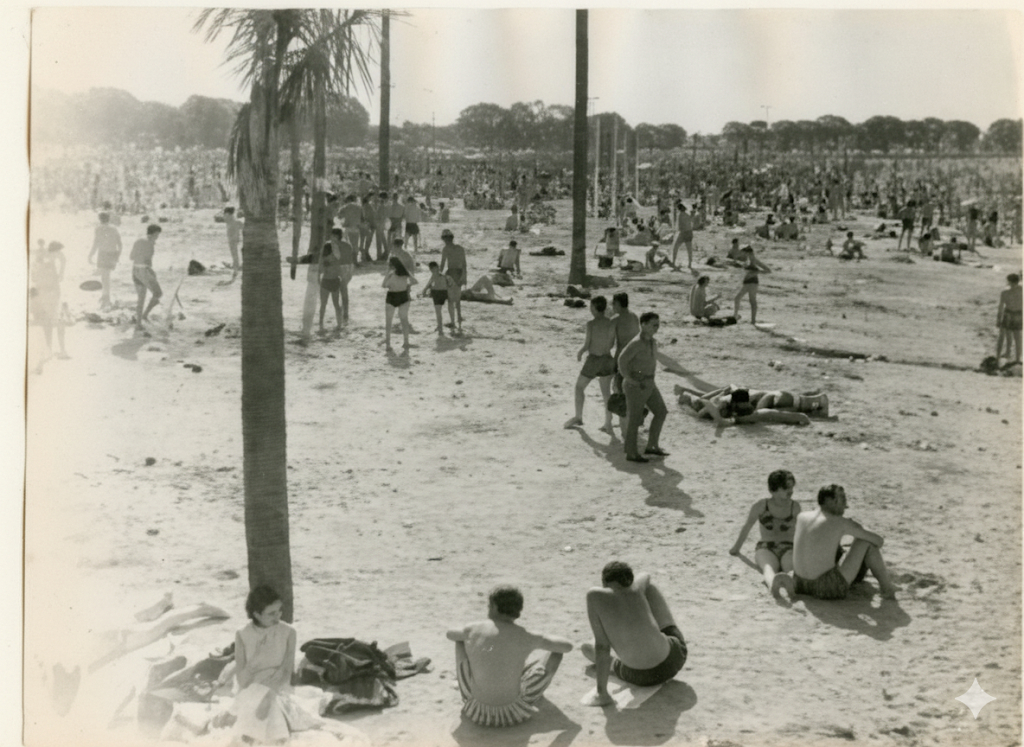 - El Paisaje Urbano: Muestran a los porteños tomando sol en reposeras y bajo sombrillas, con el imponente horizonte del Aeroparque Jorge Newbery o las estructuras de las tomas de agua de la Ciudad de fondo. Se podían ver aviones de pasajeros sobrevolando a baja altura la orilla del río.